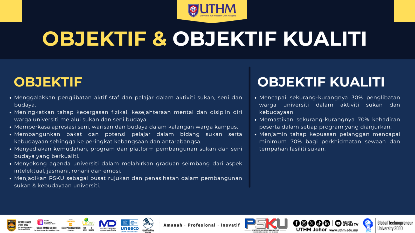 The University Sports and Cultural Centre, Universiti Tun Hussein Onn Malaysia (UTHM), is committed to protecting your privacy. Any personal information collected through this website will only be used for academic, administrative, or service-related purposes and will not be shared with third parties except as required by law.